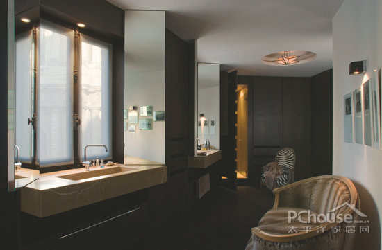 浴室:弧形墙面把卧室和浴室分隔开,洗手池安在窗台下,借助自然光平衡室内幽暗色调处理。