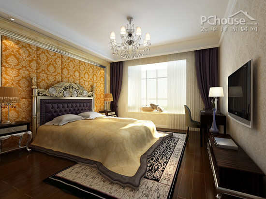 欧式的床具造型华丽,金黄色的壁纸和天花上的吊灯,都将这个卧室打造得华丽高质。旁边的飘台和随风飘动的窗纱也为这个空间增添了不少的浪漫气息。