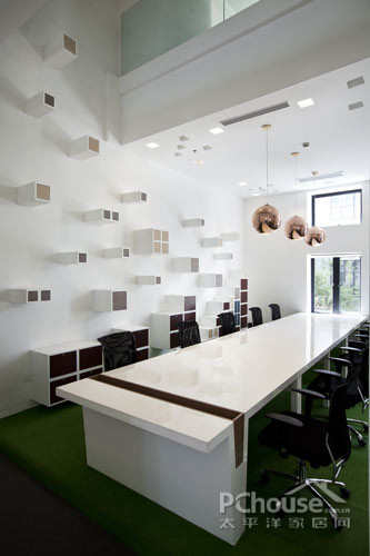 在体现时尚和轻松办公环境的同时,设计师并没有忘记办公室所应具有的功能和实用性,通过高科技玻璃隔墙和门的使用,既创造了一个开放透明的空间,又更方便员工之间的交流。