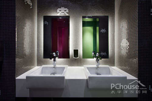 卫生间的墙面也借鉴了法国著名艺术家的涂鸦风格,将儿时游戏中的形象作为马赛克图案,在任何地方都要呈现愉悦的感觉。