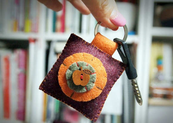 最后穿上钥匙,这样一个别致的钥匙圈就完成了,软绵绵的钥匙圈,手感很舒服哦。制作起来也非常简单,难易程度:一颗星。