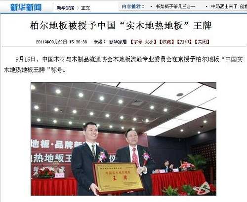 2011年9月16日,由中国木材与木制品流通协会地板委员会、浙江柏尔木业有限公司共同举行的 “中国实木地热地板王牌”授牌仪式暨新闻发布会在北京温都水城召开,新华网家居频道全程现场跟进报道。