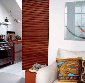 与单纯色调形成对比的是大量木质家具、凹凸的门板和隔断。尤其在厨房的建造上这一特点更为突出,橱柜和操作台同为天然木质,加上规律的横向条状凹凸,为这个不足5平米的小空间加强了纵深感。