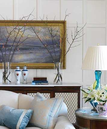 上个世纪拍下的这幅美国海景画鼓舞了客厅里苍白的色彩。一盏融合整体风格的蓝色玻璃灯让布置传统的空间显得不再那么正式。