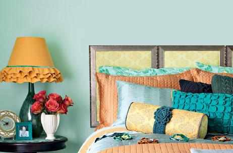 作为装饰的靠枕和床品,材质和图案风格要吻合,并注意用细节来强调局部效果。