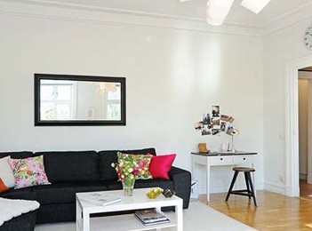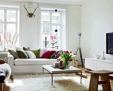 沙发区以简洁明快的配饰色彩打破视觉中的单色调僵局,简单的白色沙发因为有了缤纷色彩的靠包点缀,使得整个客厅的色彩瞬间都明亮起来。