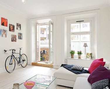 客厅整体色彩干净素雅,浅色的背景墙和沙发让空间基调利落明快,加上色彩艳丽多样的装饰品,现代感强,且不失活泼感。靠近庭院的门口斜靠了一辆自行车,随意的姿态将闲适的感觉带进客厅。
