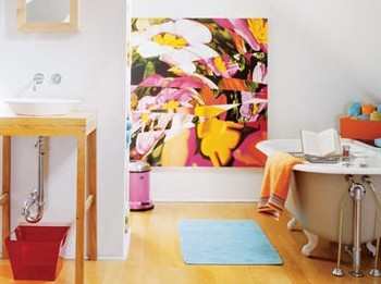 这幅大尺寸的花朵装饰画始终把浴室定格在春天,而浴缸处的小书架、收纳盒则为浴室增添了更多功能。