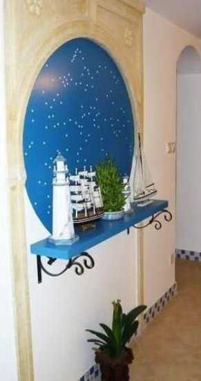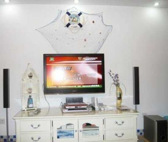 电视墙,没放电视机前,偶老爸跟他老爸意见一致,怎么挂个鱼网上去啊? 长辈是很难接受这种东西啦,我们总不能跟他们说这叫艺术吧,所以偶跟老爸开玩笑说,“其他地方花太多了,这里省点回来。”
