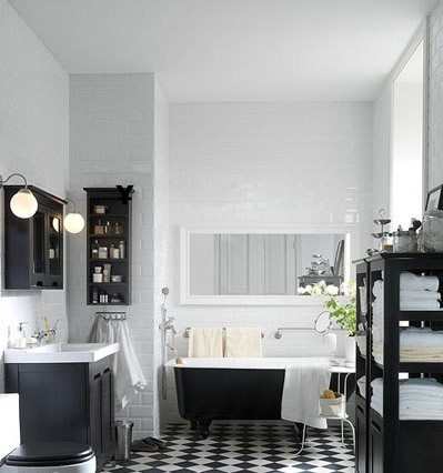 这也是一款黑白相间的卫浴间,优雅的黑白是永恒不变的经典色。花式地砖铺贴,打破了黑白色空间的单调感,并且增加了一份怀旧气息。