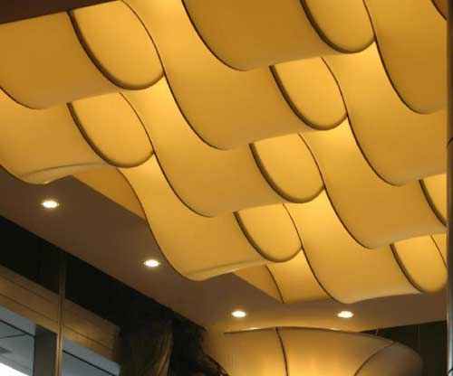 花吊顶的装修材料是区分天花名称的主要依据,主要有:轻钢龙骨石膏板天花、石膏板天花、夹板天花、异形长条铝扣板天花、方形镀漆铝扣板天花、彩绘玻璃天花、铝蜂窝穿孔吸音板天花等等。如用铝扣板做的天花,我们通常叫“铝扣板天花”。