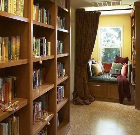 楼梯转角处也常常有这样一个小窗体,透过窗体往往有十分美丽的风景,而这个区域其实有着较为宽敞的空间,必须好好利用一番,这个案例,紧贴窗边被设计成了舒适的沙发座椅,而一侧的墙体被设计成了书架,也是一个很好的阅读区。