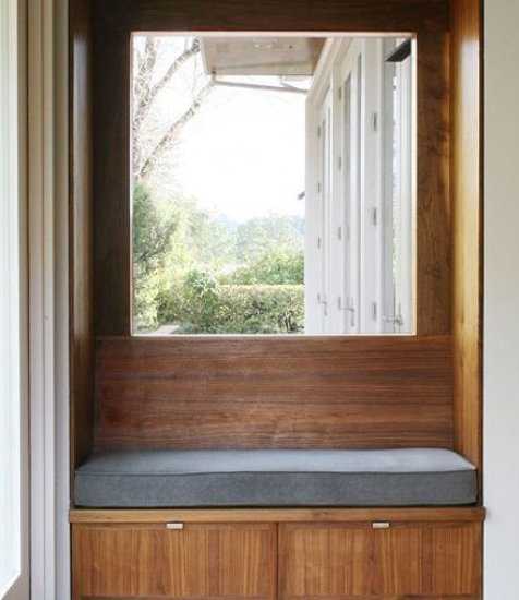 十分干净的整体窗体,正好位于进门处,将凹陷的区域,用木头打造,不仅墙面贴上了木板,窗框、座椅、收纳柜都为一体式的木头,最后放上灰色的坐垫,成就一款简约大气的玄关休息区。