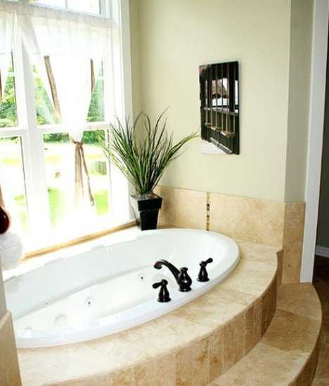 浴缸靠墙打造,采用垫高设计,并根据人性设计切割出3层台阶,除了内身的白色,周遭的贴面采用裸色大理石,铺设出优雅,内侧的植物摆设,让小角落透着氧气。