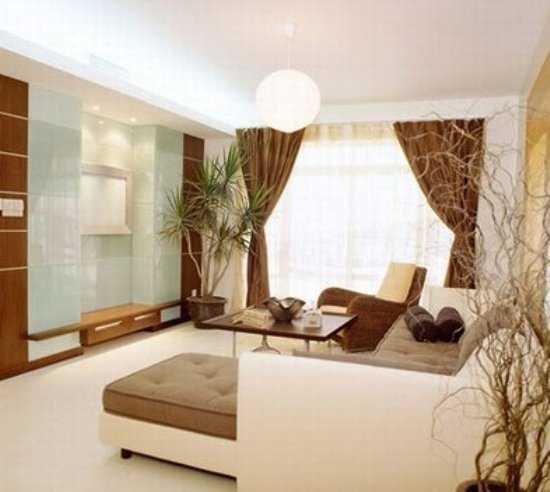浅灰色的布艺沙发,白色顺畅的壁灯吊顶,阳光透过淡黄色珠帘影射在日式的茶几上,远方翠竹点缀客厅内,在体现了主人的唯美理念的同时又充满了现代感。
