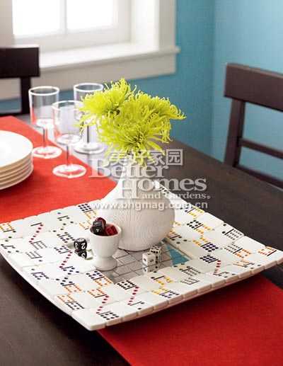错位组合的图形看上去神秘又现代,只需要一个大浅盘和多米诺骨牌、镜面瓷砖,你就可以任意拼组出自己的创意设计。选择组合出一组对你有纪念意义的数字,在满意了图形的布局后,用瓷砖粘合剂将它们固定在浅盘上。