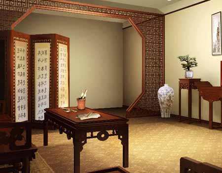 对于书房墙壁如何进行装饰,清代的李渔颇多高见:“书房之壁,最宜潇洒,欲其潇洒,切忌油漆。”上策是“石灰垩壁,磨使极光”,其次,“则用纸糊,纸糊可使屋柱窗楹共为一色”,而“壁间书画自不可少”。在书房内的装饰上,往往采用碧纱橱、屏风、竹帘、帷幕等物,以增加其美感、静趣、雅风。