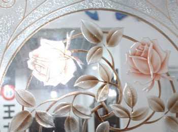产品特点:在银箔玻璃装饰中保留一块圆形的本色玻璃,再在其中雕花,一半透明一半花,有着另一番别样的美。花与叶在颜色的明暗运用也非常到位,给人立体的感觉。