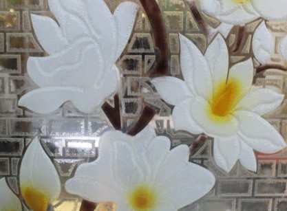 玻璃物语:洁白的花瓣,金灿的花蕊,蜿蜒的花枝,好一幅玉兰盛开图。玉兰代表着高洁与真挚,在半透明的玻璃上绽放,更能突出它的纯洁、干净。