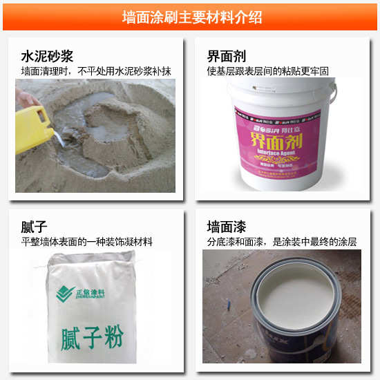 首先要做的就是材料准备。墙面涂刷需要用到的材料主要有水泥砂浆、界面剂、腻子粉、墙面漆等。先准备好需要用的材料,然后根据产品说明,按照不同的配比分别调制。
