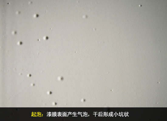 漆膜隆起成泡或破裂。产生原因主要有墙面基底水分过高,水分向外扩散时其压力把漆膜鼓起;土建时的防水处理差,导致水分通过裂缝或未上漆基面进入墙体另一面的基底,或有漏水,扩散时破坏漆膜。