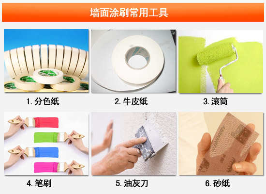 墙面涂刷常用的工具有分色纸、牛皮纸、滚筒、笔刷、油灰刀、砂纸。此外可能用到的工具还有铲刀、油漆喷枪、墨斗弹线、纤维网以及高凳、脚手板、扫帚、擦布等。