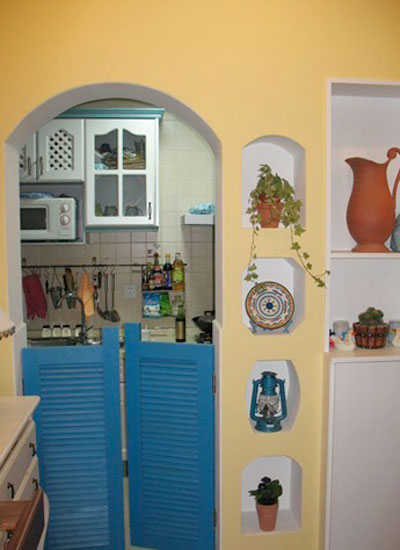 从客厅看厨房拱门、一般的小推门,体现了浓郁的地中海风味。