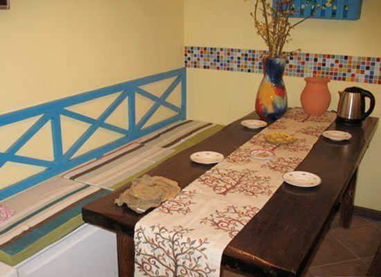 坐的椅子,桌旗是用做窗帘剩下的布接的。椅子靠墙,用蓝色木框作为靠背,屋主的别出心裁让人佩服。