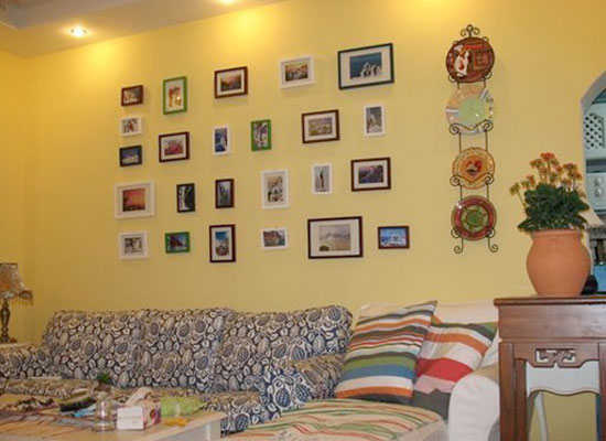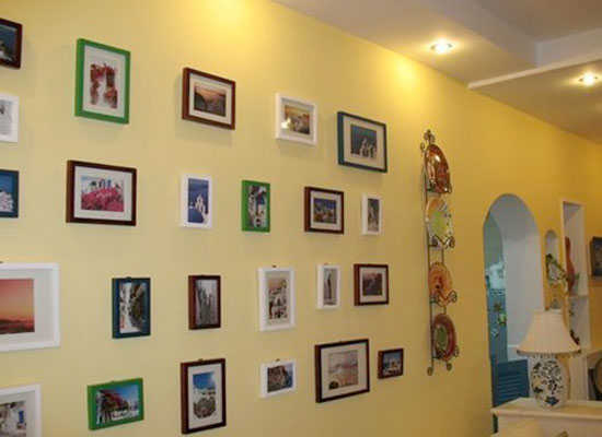 屋主一直想有一面照片墙,今天终于实现了,黄色的墙面挂上各种出游照片。