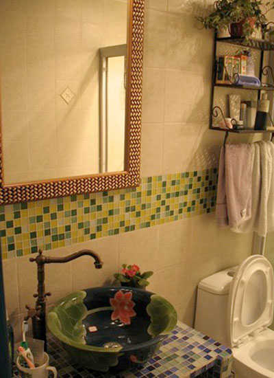 面盆是中式的,水龙头有点像国外破旧旅馆那种,两种风格的对冲。