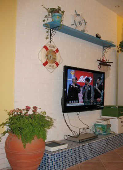 客厅电视墙,蓝白格子相间,突出地中海风格的要点。