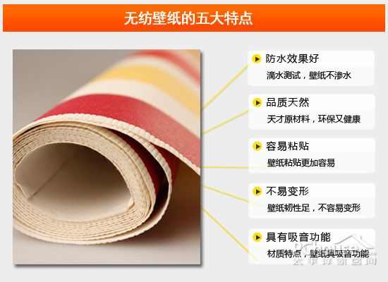 与普通墙纸相比,无纺壁纸更易张贴,更防水,不易扒缝,无翘曲,接缝处完好如初,天然品质,气味芳香,时尚气派。以纯无纺布为基材,表面采用水性油墨印刷后涂上特殊材料,经特殊加工而成,具有吸音、不变形等优点,并且有强大的呼吸性能。因为其非常地薄,施工起来非常容易,非常适合喜欢DIY的年轻人。