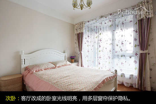④由客厅改造,面积够大,光线明亮。如果把公共空间改造成卧室,一定要注重私密性、舒适性,用窗帘等保护隐私、避免太强烈光照。