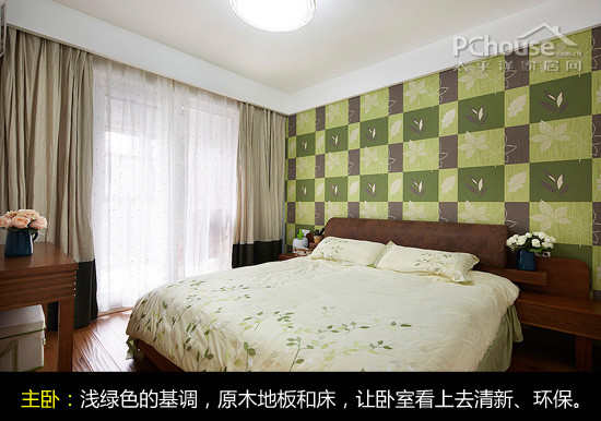 实用卧室设计:①位置在客厅后面,带了一个大阳台,光线充足。同样只用了墙纸、简单家具来装饰,没有多余造型。浅绿色基调搭配原木地板,非常清新、环保。