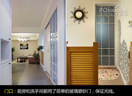 ③厨房和洗手间面积都不打,设计了简单的玻璃磨砂门,既保证隐私,又能引入自然光线,是很常见的一种设计。