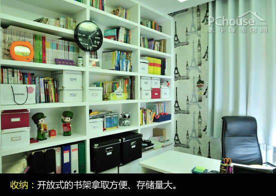 收纳亮点 | ①定做书柜满足储藏功能。 ②划分工作区、轻松办公。 ③CD墙、壁纸营造氛围。 | ||