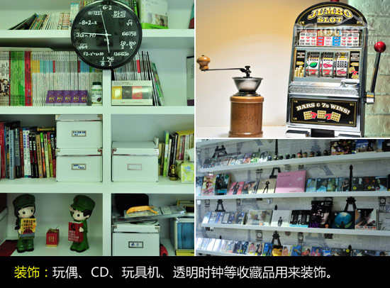 不同颜色的书籍、CD既是收藏品,五颜六色的搭配也形成了一种特色装饰。