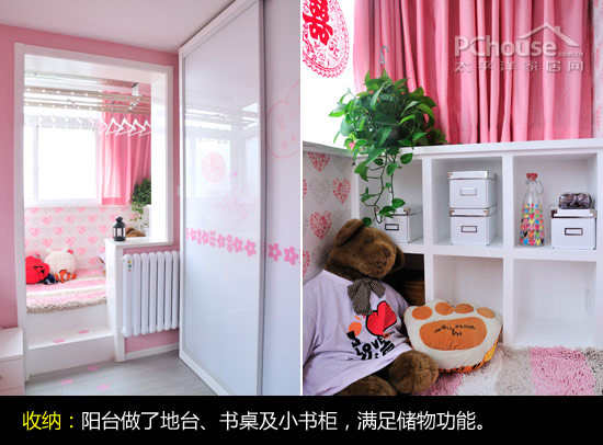 收纳亮点 | ①红白基调增加明亮度,放大空间。 ②阳台改地台,增加2㎡的收纳空间。 ③粉色壁纸、爱心墙贴等装饰凸显浪漫。 | ||
