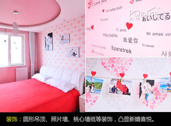 这是业主的婚房,设计师用粉色圆形吊顶、粉色桃心壁纸、粉色墙壁等温馨的色彩和元素来凸显新婚的喜悦。在细节上,用各种语言的“我爱你”和红色爱心来装饰。这些都是很容易实现的小设计,网友可以在家里DIY设计。