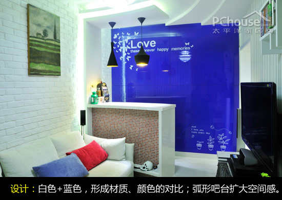 根据业主的需要设计了吧台,弧形吧台让原本局促的空间感觉宽敞,用起来更舒服。烤漆玻璃上贴的可爱墙贴,给房间增添了活跃的气息。