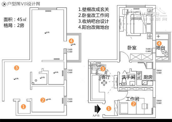 | 设计效果 | 15㎡的空间有了玄关、客厅、吧台,功能齐全。 | ||