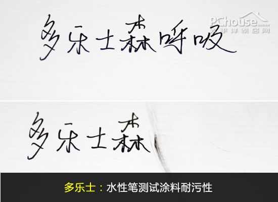 以油性笔写上字,随后以湿抹布擦除字迹,字迹无擦除的痕迹,说明此款涂料不耐油性笔的污渍。