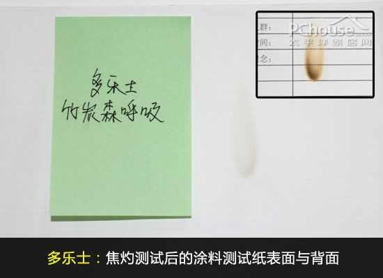 对刷上了多乐士竹炭森呼吸全效墙面漆测试纸以打火机燃烧10秒钟的时间。10秒钟后,观察到涂料表面只出现相对轻微的焦灼痕迹,而背面,也无较深的灼烧后的颜色。