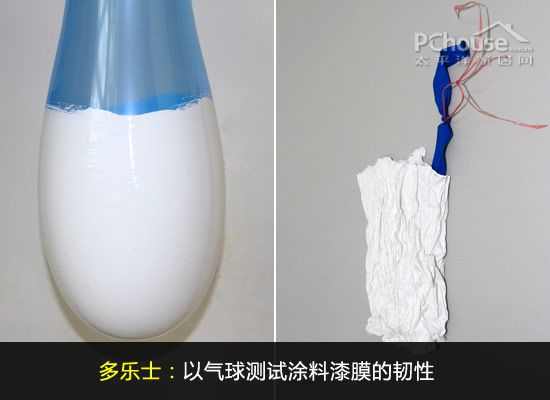 对多乐士竹炭森呼吸全效墙面漆测进行漆膜韧性的测试,观察其刷上涂料的气球放气后,漆膜无出现明显的漆膜碎屑脱落与漆膜撕裂的现象,说明这款涂料具有非常高质量的涂料韧性与附着力。