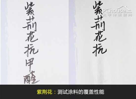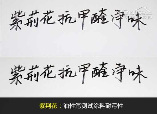 同样的,对紫荆花抗甲醛净味多功能墙面漆进行字迹覆盖后对比,其字迹以涂料覆盖后,基本能够将字迹覆盖住。