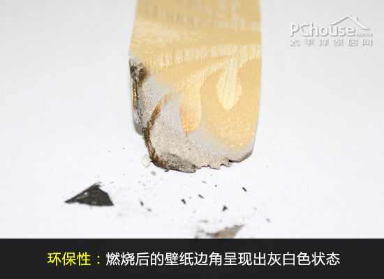 燃烧后的壁纸边角呈现出灰白色状态,无起球与结块的现象,燃烧后掉落的灰烬捏碎后呈粉末状。说明此款壁纸选用的为天然植物纤维制成的纯纸壁纸。