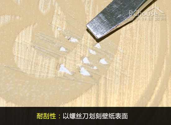 此款壁纸在壁纸质感上相对坚韧厚实,以锐器进行磨损也不容易产生明显的刮损,但壁纸表面的颜色会出现明显的金属划痕。因此,采用这款壁纸应尽量避免日常的人为磨损。