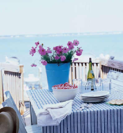 门廊是凝视远方的海景最佳地点,硬硬的长板凳摆在餐桌一边,另一边是可折叠的椅子,蓝色条纹桌布打开了惬意的午餐心情。