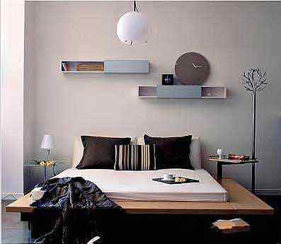 利落的线条充满整个房间,原木色的宽边床可移动的小几设计周到,背景墙上错落安置的CD架,利用材料的多元变化和几何造型的有机融入,让视觉呈现出舒缓的起伏,金属衣架竖立要床旁,既实用又强调了空间的设计感。