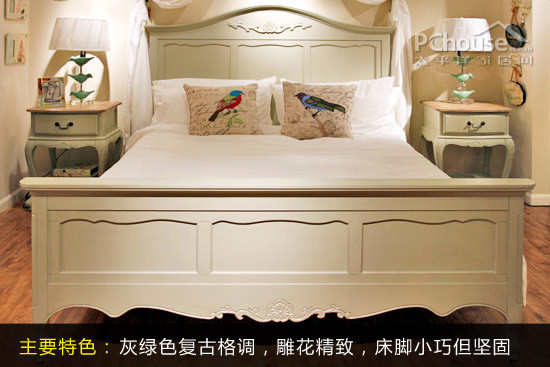 特色推介:淡淡的灰绿色格调,搭配床头流线型设计,整体协调和谐。床头与床尾板雕刻着特色雕花,更是耐人寻味。床脚设计小巧,精致,但合理的结构能让它们支撑着整个床的重量,优雅得体。 | |||||